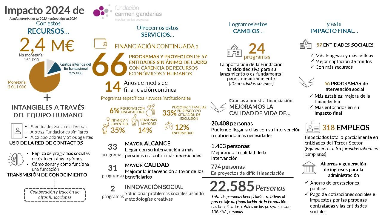 - La Fundación ha destinado 2,4 millones al fin fundacional en 2024, de los que 2,16 millones han sido ayudas directas a entidades sin ánimo de lucro, tanto monetarias como no monetarias. A ello se añade la ayuda intangible que proporcionamos a aquellas entidades sociales a las que asesoramos y apoyamos con nuestros conocimientos, experiencia y red de contactos.